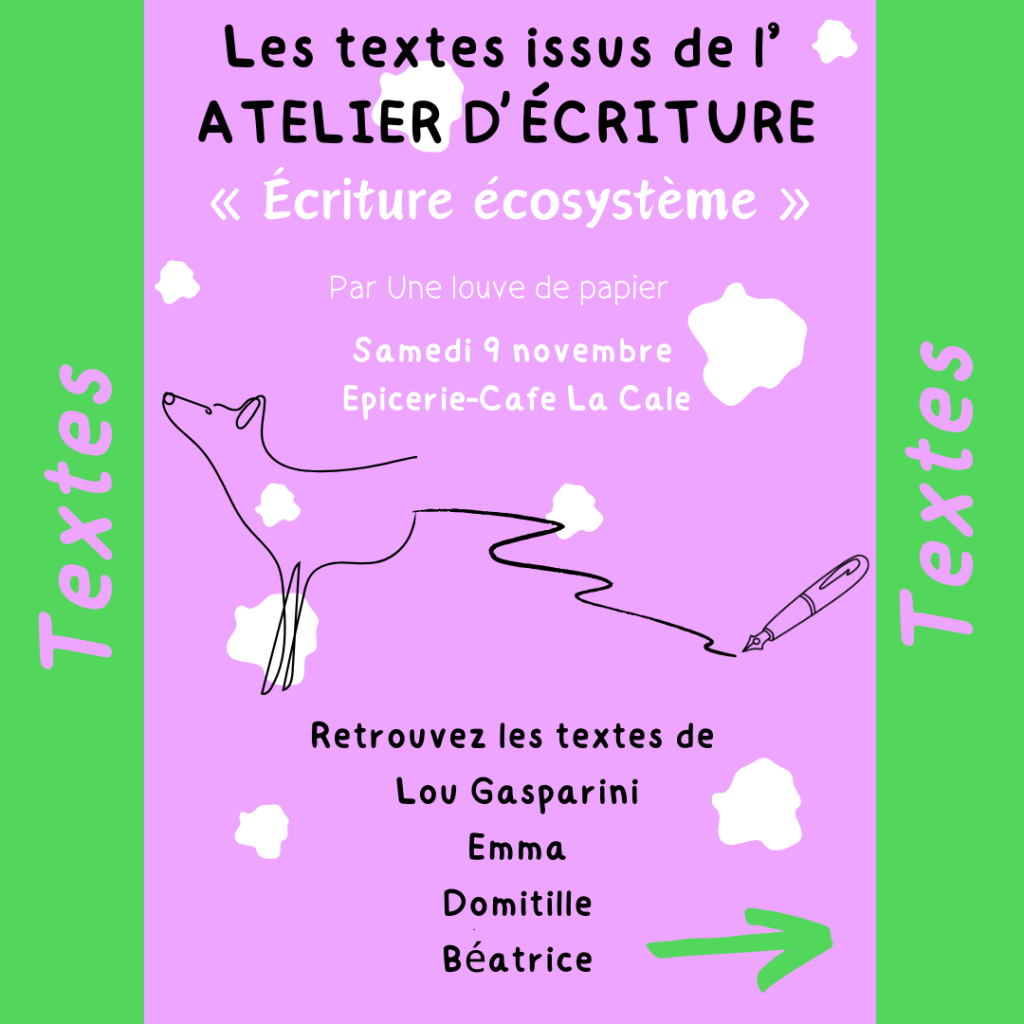 Découvrez les textes qu’on a écrit ensemble à La Cale le 09/11/2024, petit écosystème d’écritures qui se sont rencontrées ce jour-là dans un lieu propice à l’inspiration.